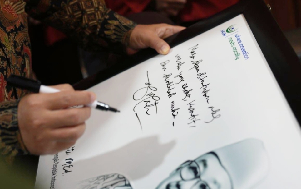 Mendikdasmen Abdul Mu’ti membubuhkan tanda tangan pada quotes yang ditulis untu SAIM Surabaya